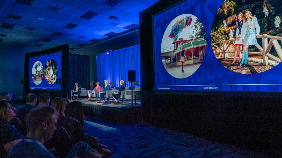 Excitement was palpable for the historic moment of having three of the earliest Disney Ambassadors on stage altogether for the first time ever. First Disney Ambassador and Disney Legend Julie Reihm Casaletto, 1966 Disney Ambassador Connie Swanson Lane, and first Walt Disney World Ambassador Debby Dane Browne joined a panel of their peers to give Disney fans insight to the Disney Ambassador program and their experiences in the unique role. “I can’t even begin to tell you how honored I am to be sitting between these amazing two ladies. They are my idols and I don’t know why it took over half a century to meet both of them but here we are and I’m so blessed to be here,” Debby playfully shared as the presentation began.