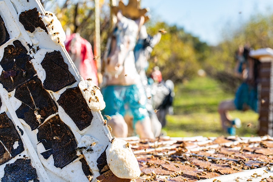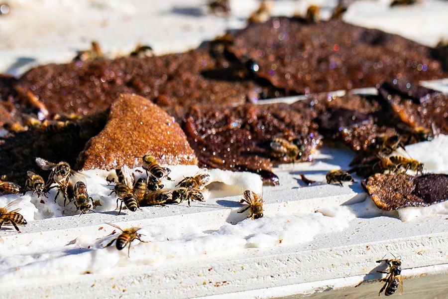 Once cast members have cleared the displays of the gingerbread pieces, the wooden frames that hold the structures together are carefully taken apart and whisked away to our tree farm. That’s where our pollinator pals buzz in to help! Local bees feed off the frosting left on the frames as a sweet treat courtesy of our culinary teams — the perfect energy boost to fuel up on before they fly off to other pollinator pursuits that lead to honey making.