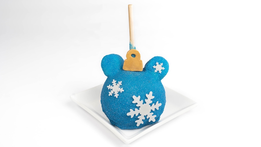 Mickey Blue Ornament Apple: Granny Smith Caramel Apple with a White Chocolatey Coating, Marshmallows, Blue Sugar, and Fondant Snowflakes.