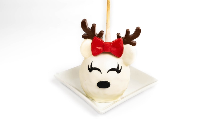 Minnie Reindeer Apple: Granny Smith Caramel Apple with a White Chocolatey Coating and Red Bow, Marshmallows, Milk Chocolate Antlers, and Fondant features.