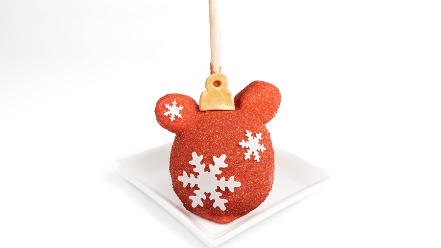 Mickey Red Ornament Apple: Granny Smith Caramel Apple with a White Chocolatey Coating, Marshmallows, Red Sugar, and Fondant Snowflakes.