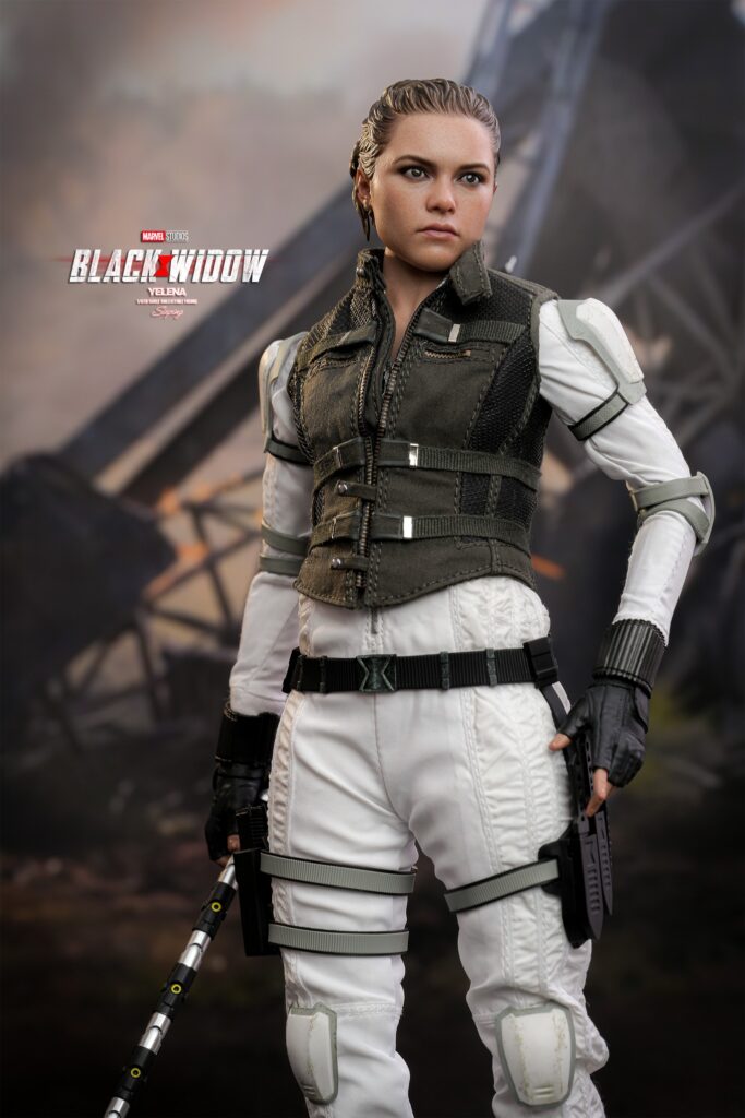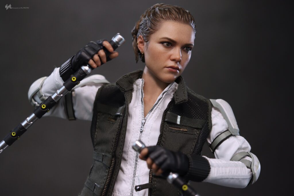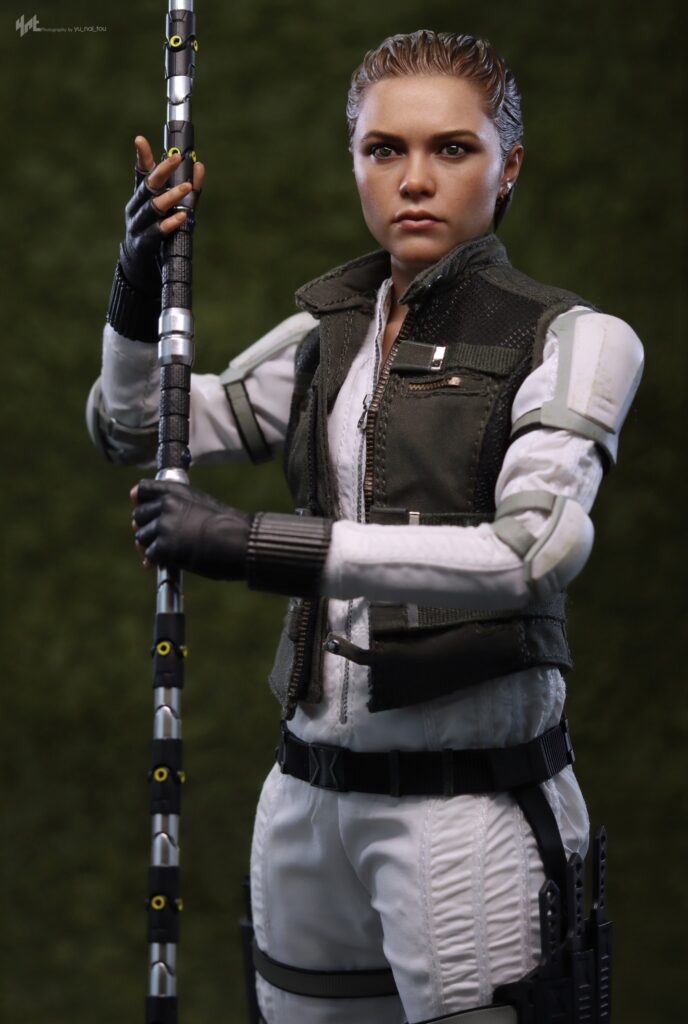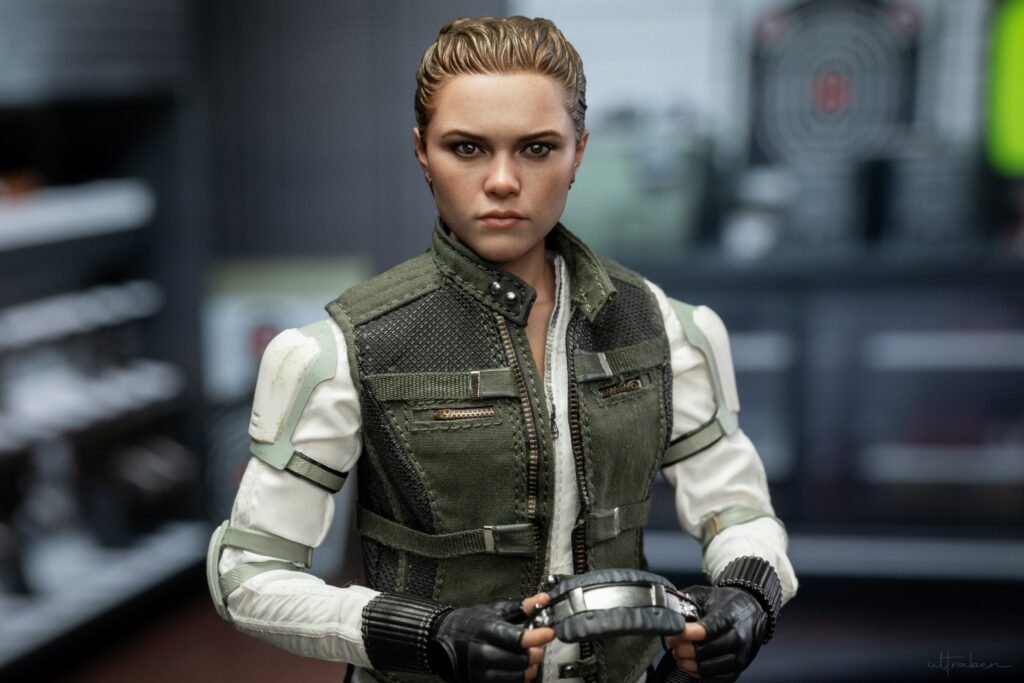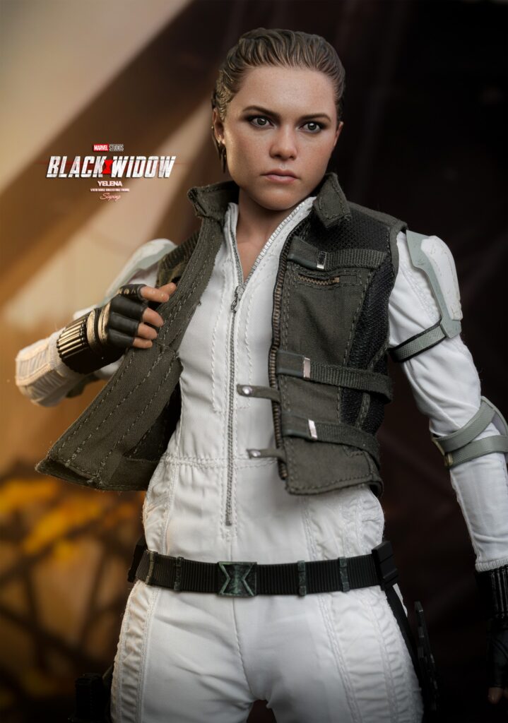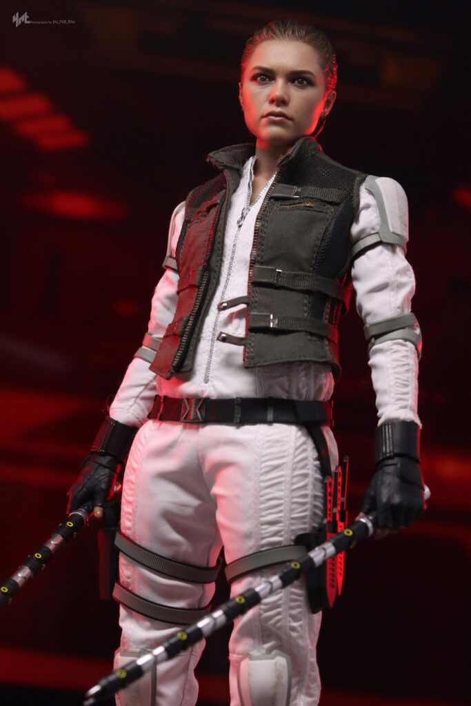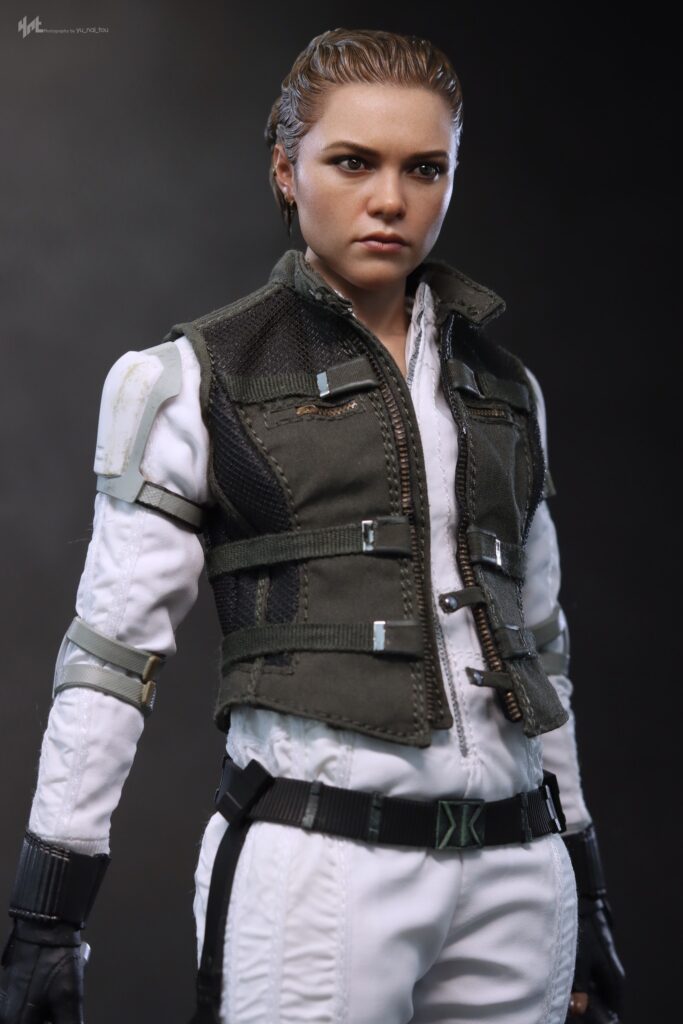 Today Hot Toys is sharing blogger photos of the 1/6th scale Yelena collectible figure in her tactic vest with many pockets.