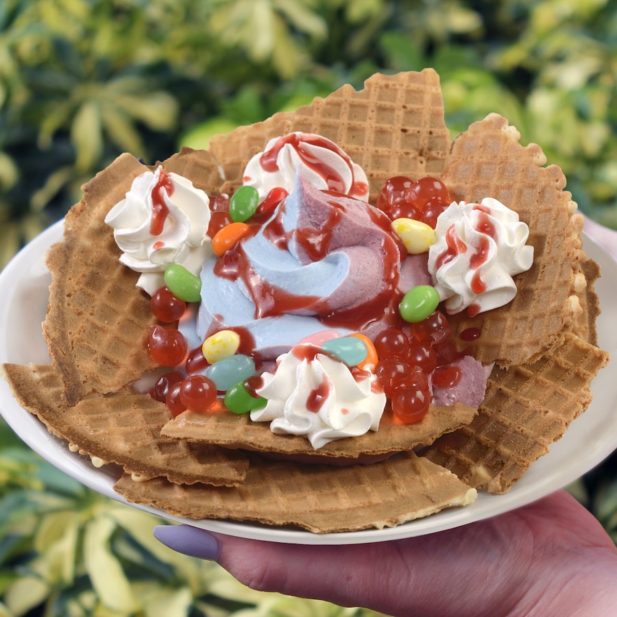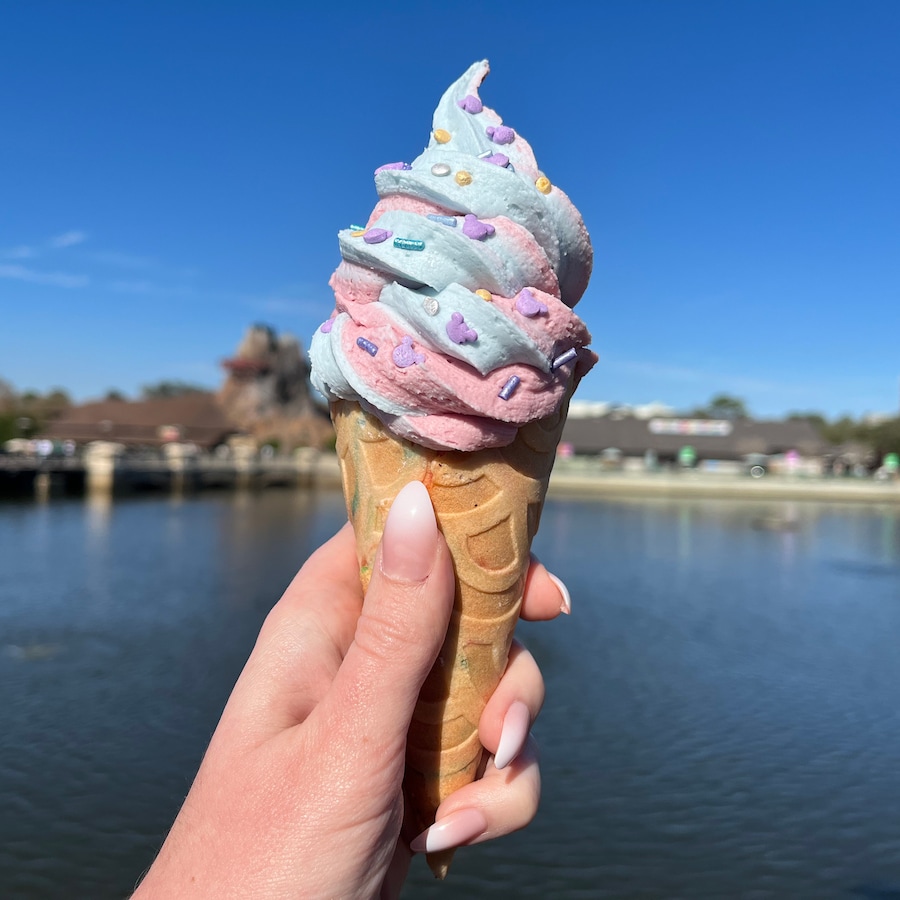 For a cool and refreshing spring treat, enjoy Easter-themed delights at Swirls on the Water at Disney Springs. The Cotton Candy Cone consists of DOLE Whip Raspberry and Cotton Candy Soft Serve swirled on top of a Celebration Cone and topped with sprinkles. Or go big with the Easter Basket Nachos, made up of a bed of waffle chips covered in DOLE Whip Raspberry and Cotton Candy Soft Serve, Jelly Beans, Raspberry Sauce, Strawberry Boba, and Whip Cream.