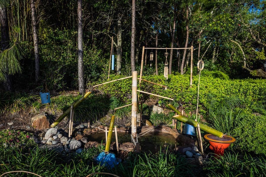 Shishi-odoshi translates to “scare deer” and consists of a segmented tube, usually of bamboo, water and rocks. As a slow trickle of water fills the segmented bamboo tube, the device tips and creates a distinct thud, scaring away deer, boar and other herbivores to prevent them from eating crops.