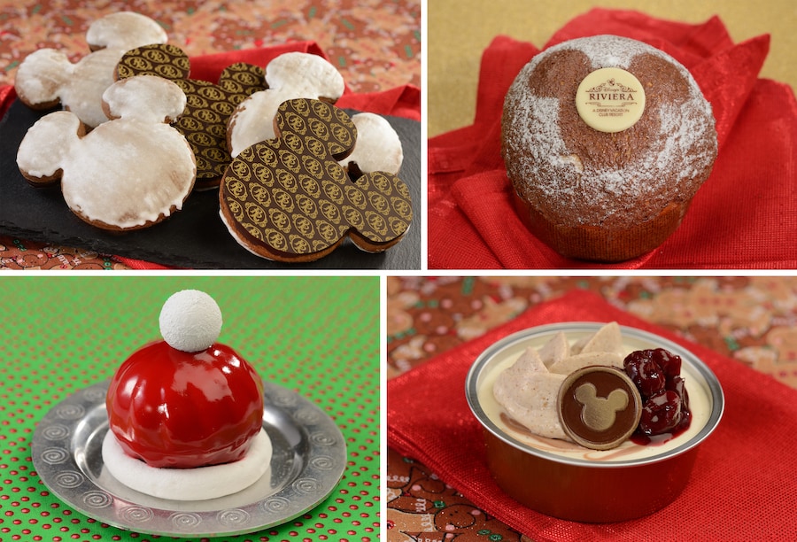 Vanilla, Cherry, and Gingerbread Cheesecake: Vanilla cheesecake with chocolate cheesecake swirl, Morello cherries, whipped gingerbread panna cotta, and milk chocolate Mickey coin (New)