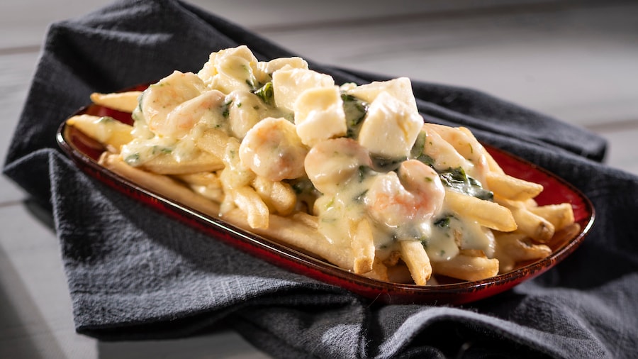 Shrimp Scampi Poutine with cheese curds, lemon-garlic cheese fondue, spinach, and artichokes (New)