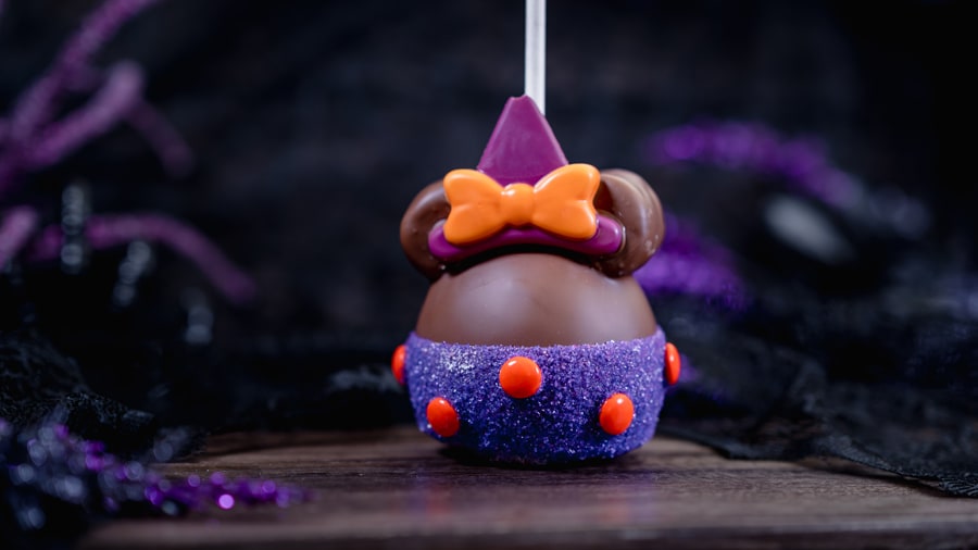 Minnie Witch Apple: Granny Smith Apple dipped in caramel with marshmallow ears enrobed in milk chocolate and dipped in white chocolate and orange M&M’S chocolate candies placed all over and rolled in purple sugar
