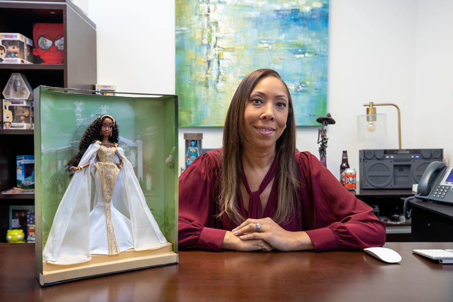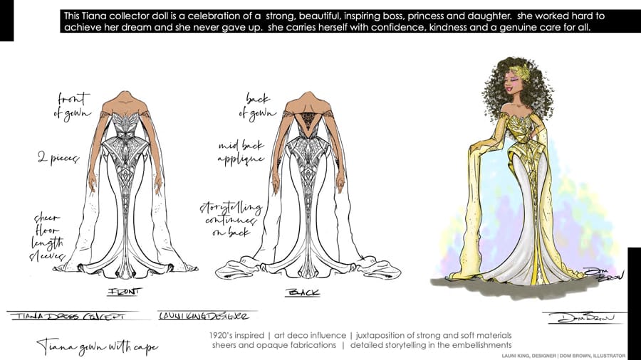 When I started designing the Tiana collector doll, I was inspired by the art deco aesthetic of the roaring 20s, both in architecture and accessories, which you can see in the structure of the dress. I also wanted to celebrate our hair, which is curly, distinctive and part of our culture. Tiana’s hair is down and out, showcasing its beauty and highlighted by an extravagant headpiece. Throughout the dress and cape, the storytelling is subtle with kitchen equipment, frogs and more. Senior Manager of Product Design and fellow Black Talent Network colleague Dom Brown illustrated my vision and truly brought her to life. My hope is that everyone who sees her will want to know more about the stories and people that influenced her creation.