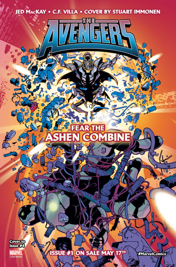 Ahead of next week’s launch of Jed MacKay and C.F. Villa’s new run of AVENGERS, check out Stuart Immonen’s cover for August’s AVENGERS #4! The action-packed cover spotlights the deadly upcoming showdown between Iron Man and Citysmith, a member of the new villain team, THE ASHEN COMBINE!