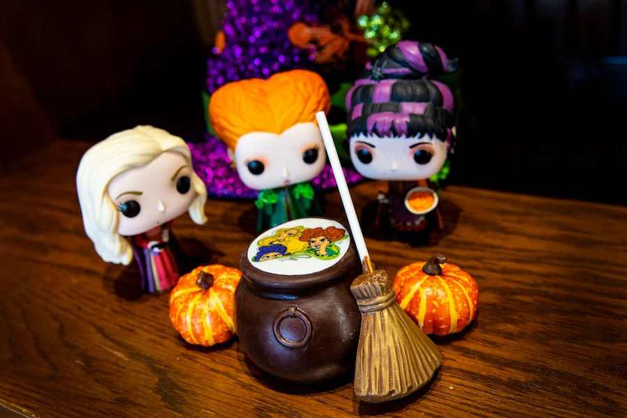 Sister’s Elixir Hot Cocoa Bomb: Dark chocolate cauldron filled with hot cocoa mix and marshmallows topped with an edible image of the Sanderson Sisters and a chocolate broom stirrer