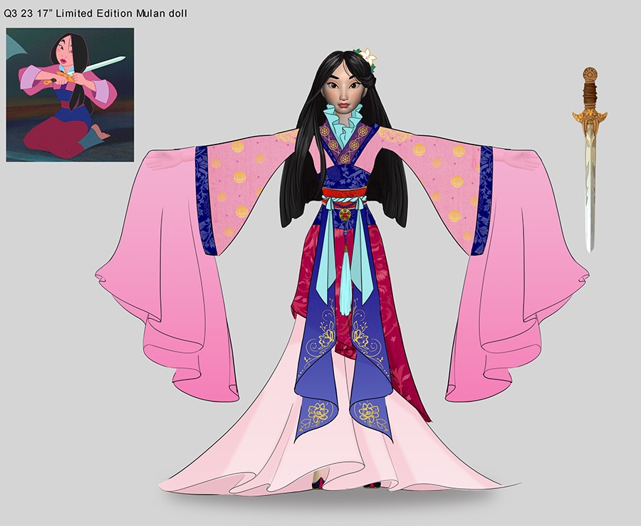 As with the animated character, the doll blends inner strength with outer beauty. J was responsible for the overall look and design, which was developed from an early concept sketch. The elegantly designed 17-inch collectible doll boasts a finely embroidered and ornately detailed costume in beautiful pink, red and blue colors. Her gown is complete with layers of organza and satin with brocade, golden beads and tassels.