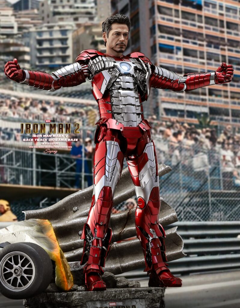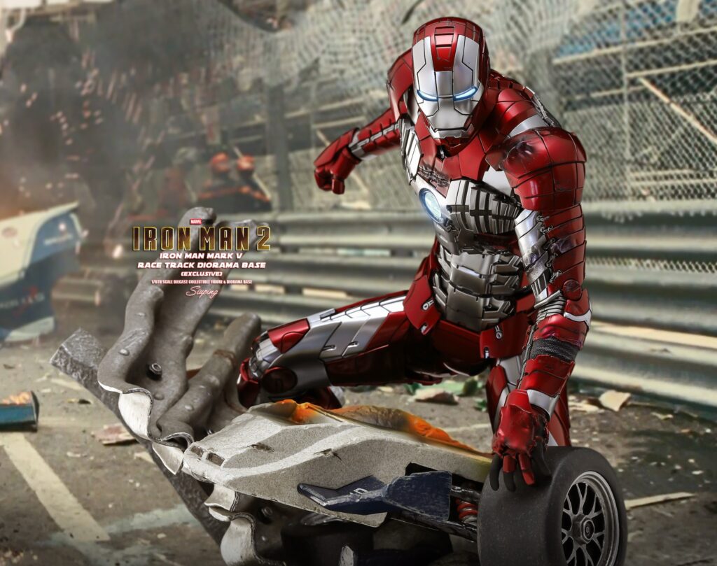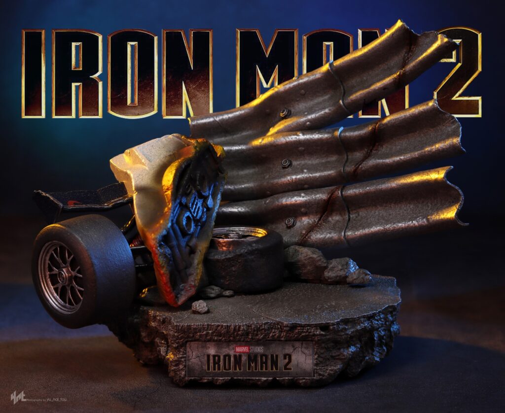 The figure exclusively includes a highly elaborated diorama base reminiscent of the dramatic showdown between Iron Man and Whiplash, complete with damaged motor parts and guard rail from the circuit.