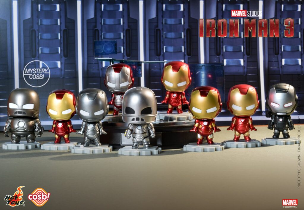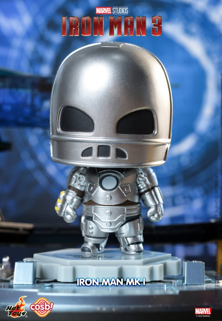 Iron Man Cosbi Bobble-Head Collection features Mark I, Mark II, Mark III, Mark IV, Mark V, Mark VI, Mark VI, War Machine, and Iron Monger (Mystery) Cosbi. Each random package box includes a 7.5 cm tall Cosbi collectible of your favorite characters, a special collection card, and a connectable puzzle base, comes sealed in a foil bag and blind boxed to preserve the rarity and collectability of the series. Available in selected markets only.