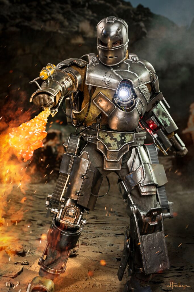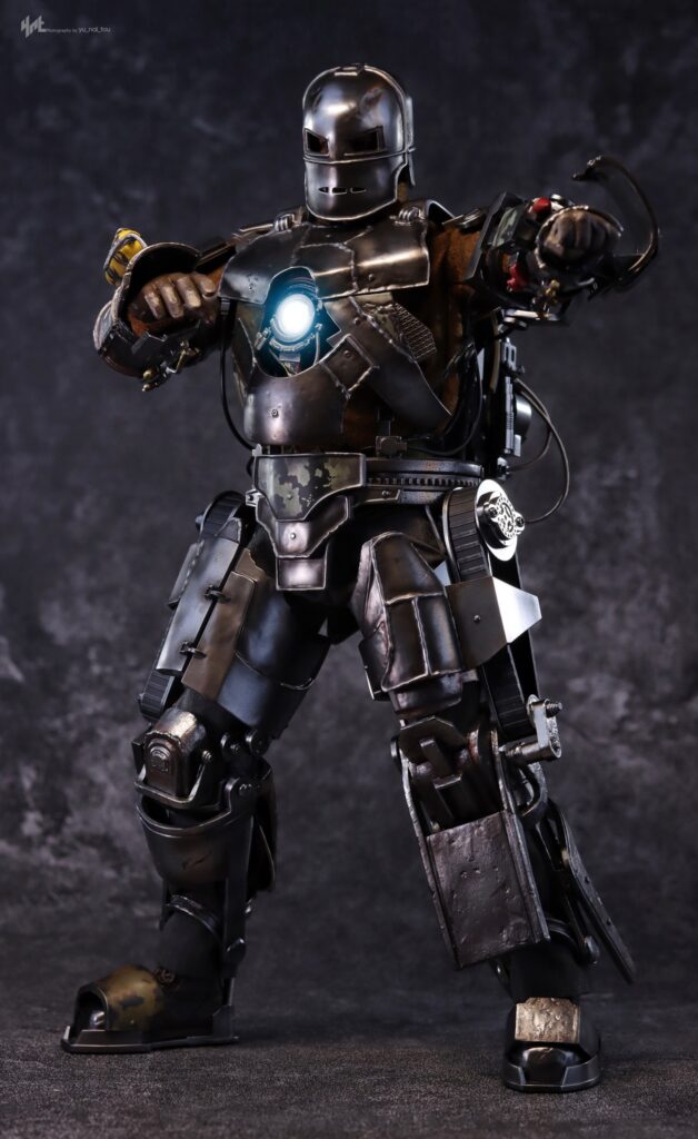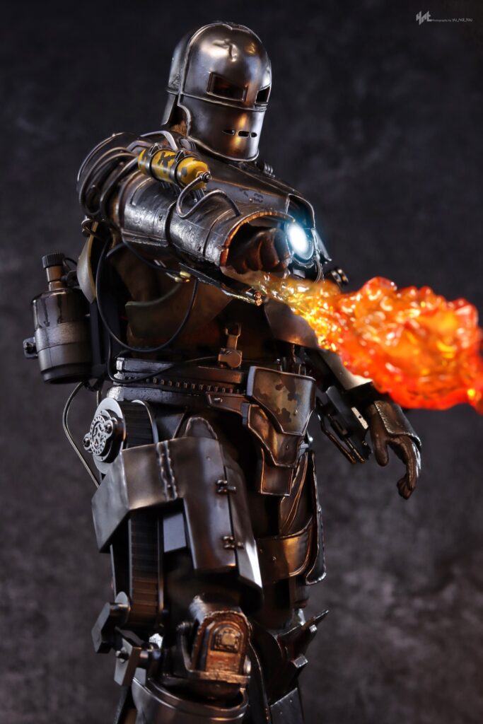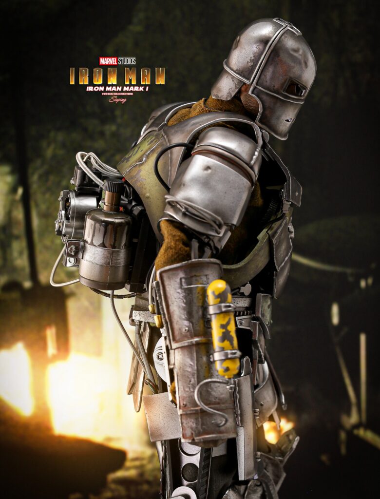 The 1/6th scale Iron Man Mark I collectible figure crafted with diecast material is based on its appearance in the first Iron Man movie. Features a helmeted head sculpt of Robert Downey Jr. as Tony Stark; delicate diecast Mark I armor parts with real wires and cables attached showcases armor’s complexity; multiple layers of steel-like painting in metallic silver and bronze to modify texture and weathering effects; LED light-up functions on Arc Reactor and forearm; engine motor on the back with rotary design simulating a running engine; the Flamethrower and effect accessories; also a themed diorama base to complete the collection experience.