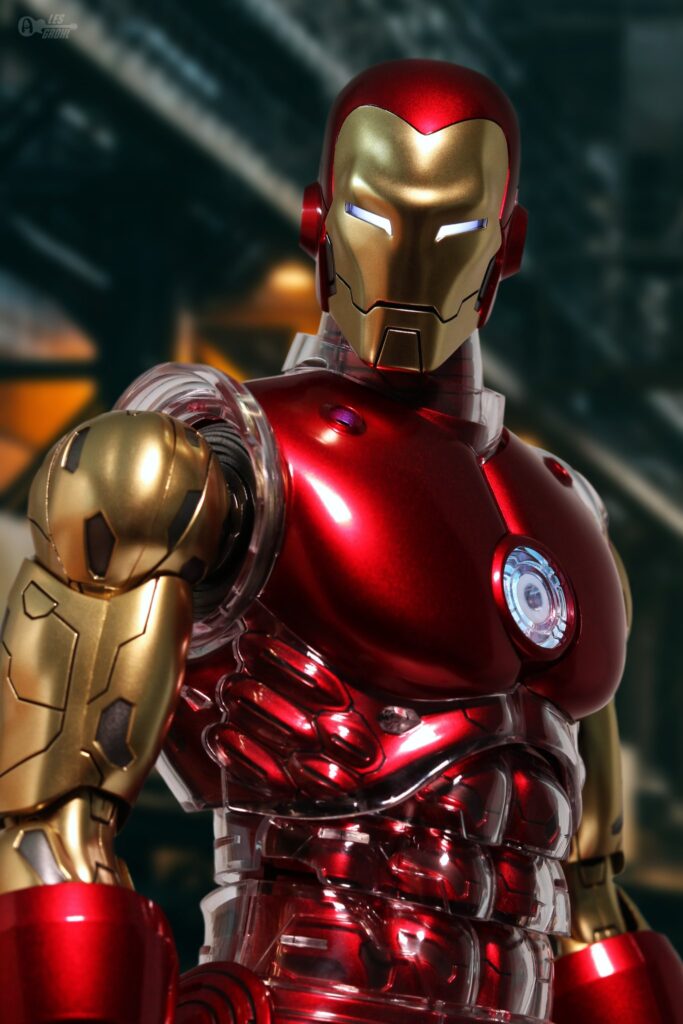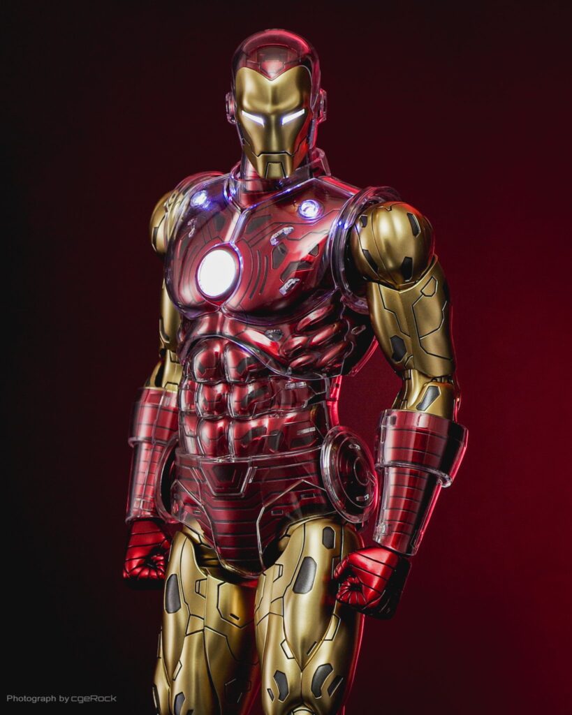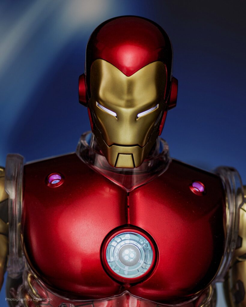 Exquisitely crafted based on Iron Man in comic pages, the figure features a newly crafted helmet head with LED-light up function; intricate design of the Iron Man armor and structure illustrating its mechanical detail; carefully painted in red and gold coloring with a metallic appearance; crystal clear armor parts, interchangeable mask and armor parts for different styles of display; LED light-up functions scattered throughout the upper body, Arc Reactor on chest and palms; and interchangeable hands.