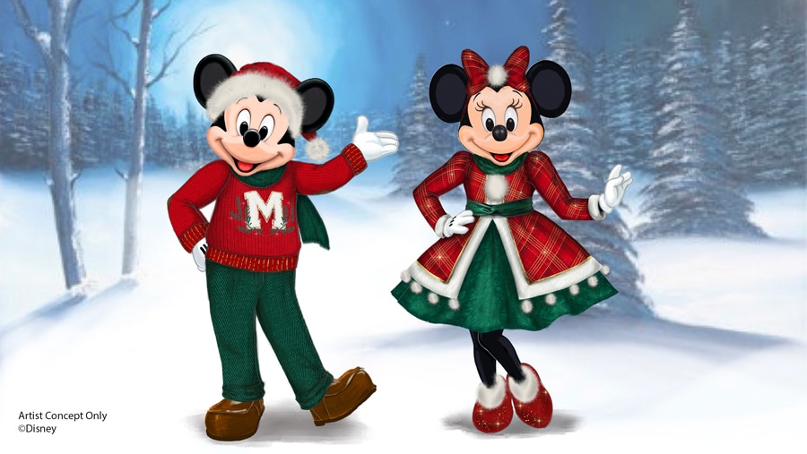Celebrating the season with their snazzy style, Mickey Mouse, Minnie Mouse and their pals will don their holiday finest and newest fashions in Town Square at Disneyland park! These festive new looks reflect this year’s warm, vintage-inspired holiday celebration. In classic red and green, their holiday attire is being designed in wintry textures and patterns such as velvet, chenille, herringbone and plaid, and accented with gold for a touch of sparkle.