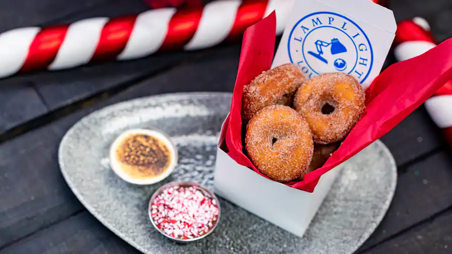 Lamplight Lounge Peppermint Donuts – Hot cocoa-dusted donuts with toasted marshmallow crème and peppermint-chocolate dipping sauce