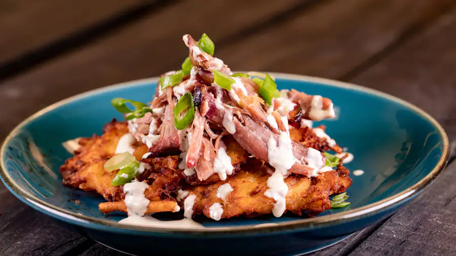 Smokejumpers Grill Loaded Latkes -Traditional Latkes loaded with smoked brisket, topped with dairy-free horseradish cream and scallions