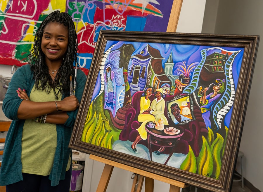 Born and raised in New Orleans, Sharika paints with a colorful and free-flowing style. Sharika’s pieces for our project have featured Tiana and friends,a jazz club scene joined by a band of frogs and even Mama Odie and her “seeing eye snake,” Juju.