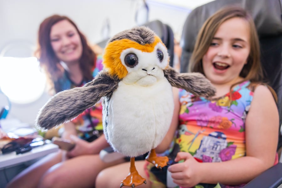 The Star Wars: Galaxy’s Edge and Disneyland Resort logos are featured in the center of the fuselage. For a lighthearted touch, cute porgs look back at passengers from both winglets and greet guests at the boarding door.