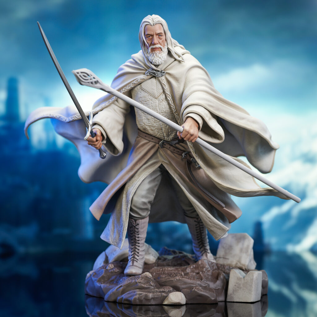 A Diamond Select Toys release! You shall not pass… not without ordering this amazing Gallery Diorama from DST! Wearing his white robes from the second and third movies in the Lord of the Rings trilogy, Gandalf holds sword and staff in hand, ready to do battle with the next orc or wizard to challenge him. Measuring approximately 9 inches tall, Gandalf is made of high-quality PVC and comes packaged in a full-color window box. Designed by Caesar, sculpted by Anissa Tchoub. SRP: $75.00