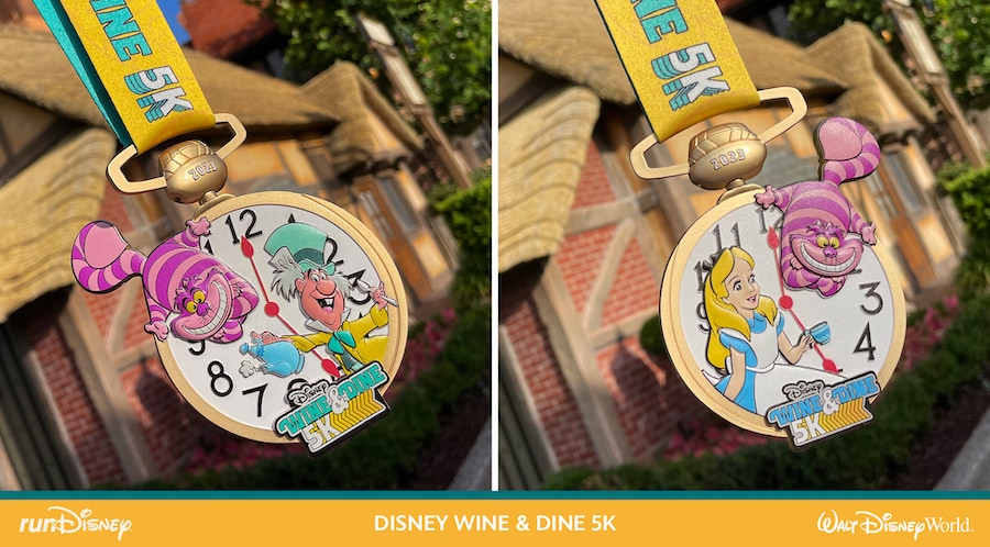 Prepare yourselves for a 3.1 mile “spin” around EPCOT with Alice, the Mad Hatter and all their Wonderland friends from Disney Animation’s “Alice in Wonderland” during the 2023 Disney Wine & Dine 5K. You won’t want to be late to the finish line so you can earn this spinning pocket watch-inspired finisher medal!