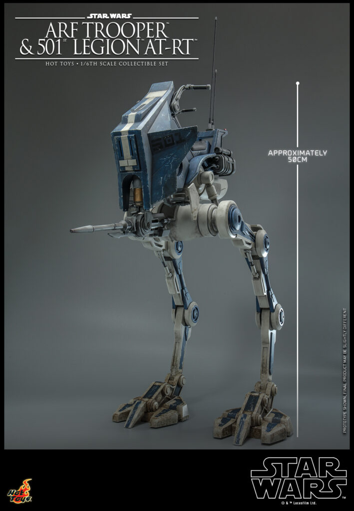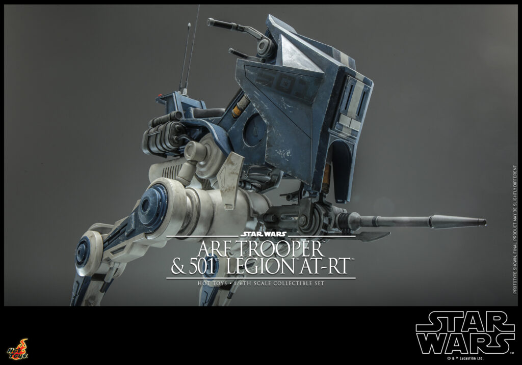 The stunningly crafted 1/6th scale 501st Legion AT-RT stands at approximately 23 – 64cm tall with the battalion’s signature blue paint application and 501 marking with weathering effects, as well as an astonishing range of articulations allowing different display poses.