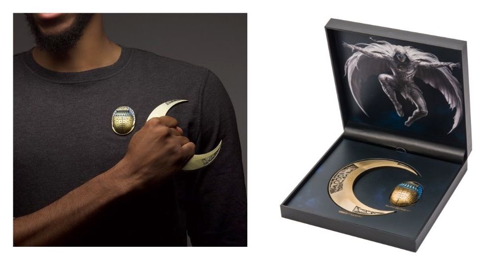 Round out your fashion collection with the limited editon GameStop exclusive Moon Knight magnetic pin box set. This set features two base metal magnetic pins with recessed details and packaged in a gorgeous high-quality collector’s box. The 2.16-in Scarab Compass has extendable wings with a 3.5-in wingspan, while the Crescent Blade is 5-in tall.