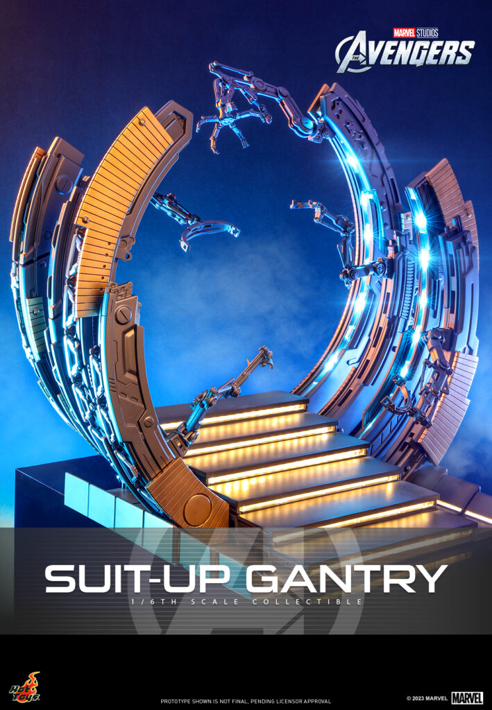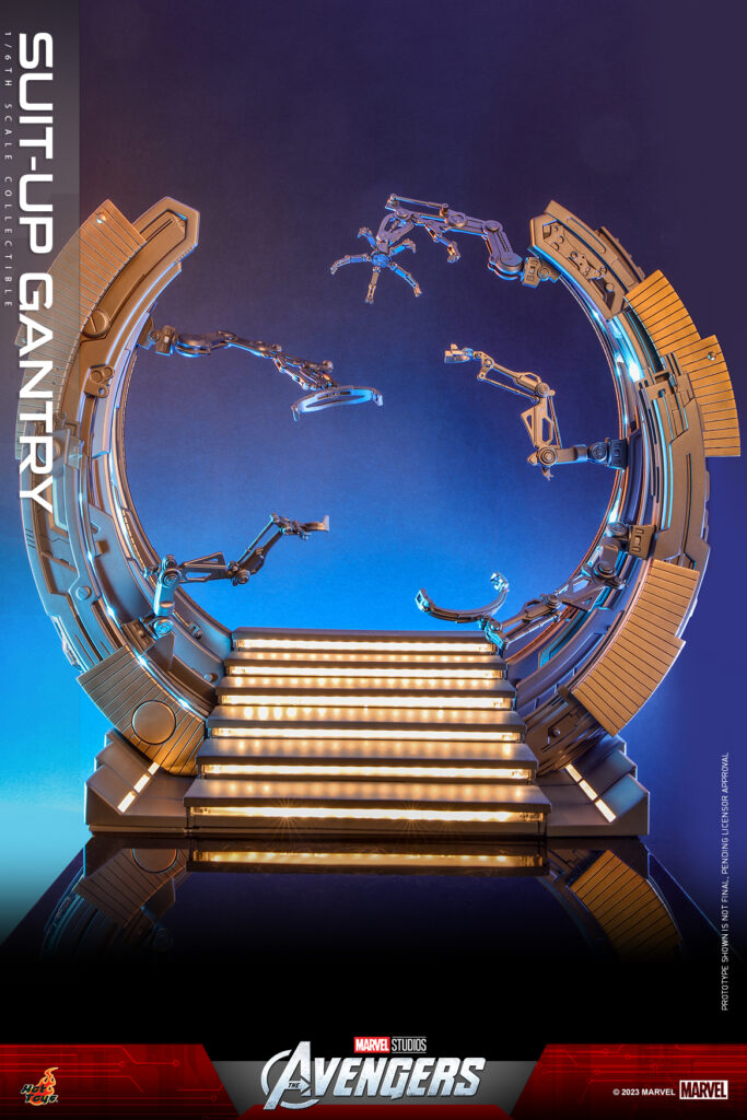 Featuring multiples articulated mechanical arms and adjustable annular tunnel, the authentically-crafted Suit-Up Gantry collectible recreates the astounding disassembling program of Iron Man’s suit with LED light-up areas located around the annular tunnel and gantry platform/stairway.