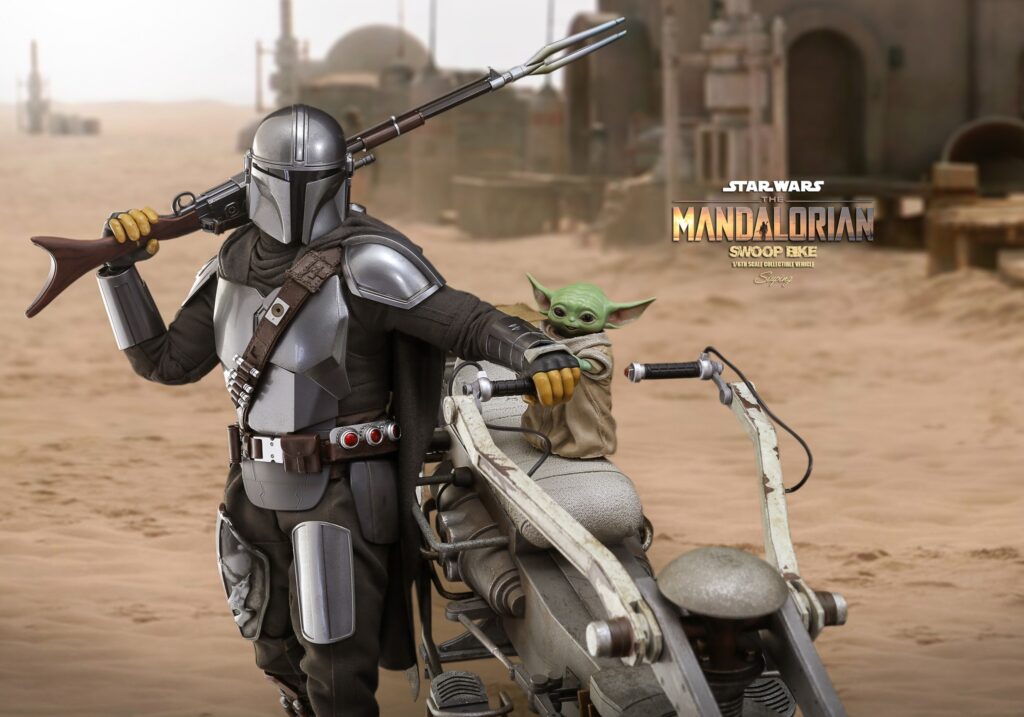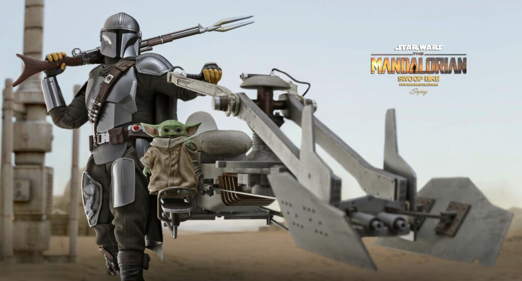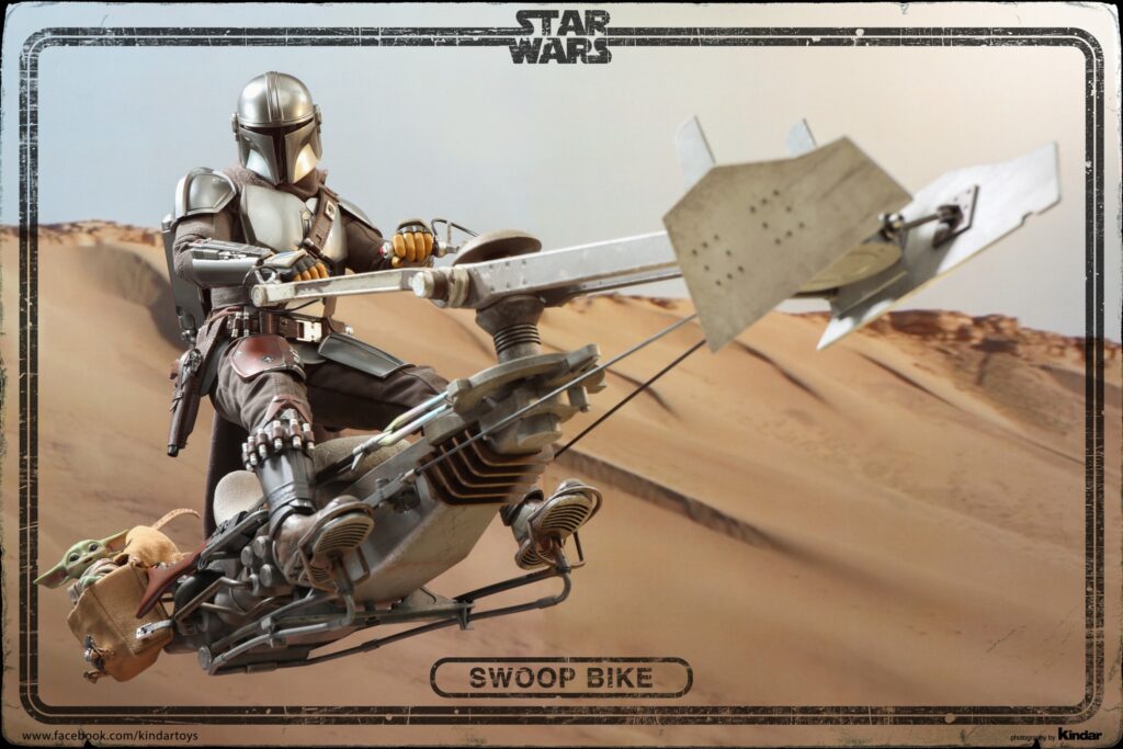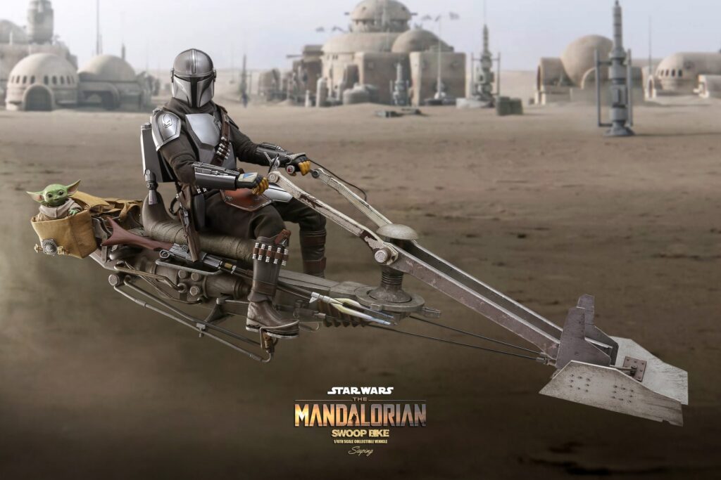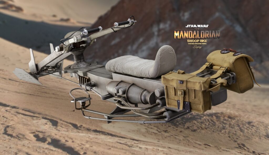 Swoops are repulsorlift vehicles that are more powerful and dangerous than speeder bikes. Swoop racing is a popular spectator sport on many planets, with fans loving the sport’s excitement as well as its outlaw image. During the Mandalorian’s journey on Tatooine, it has been a helpful transport for him to traverse the desert planet.