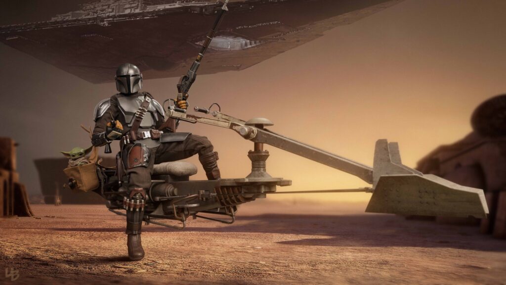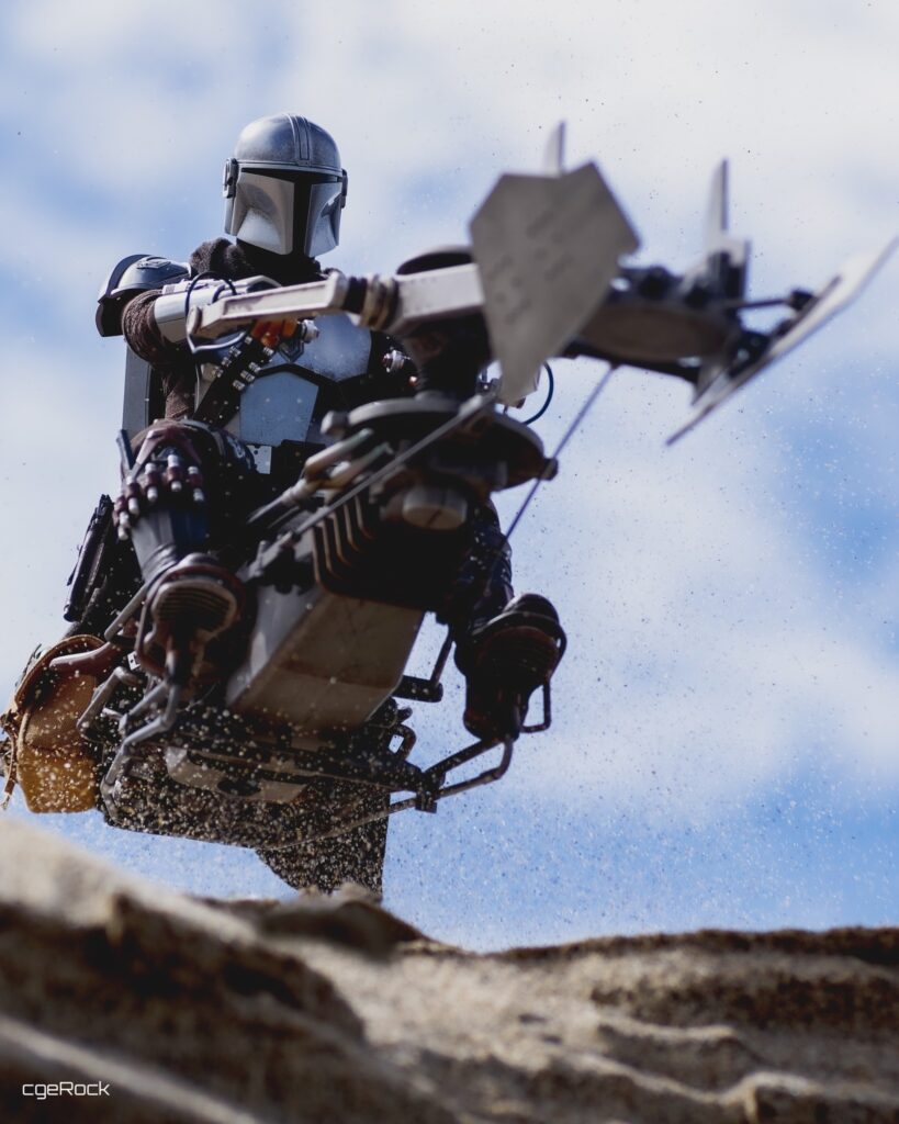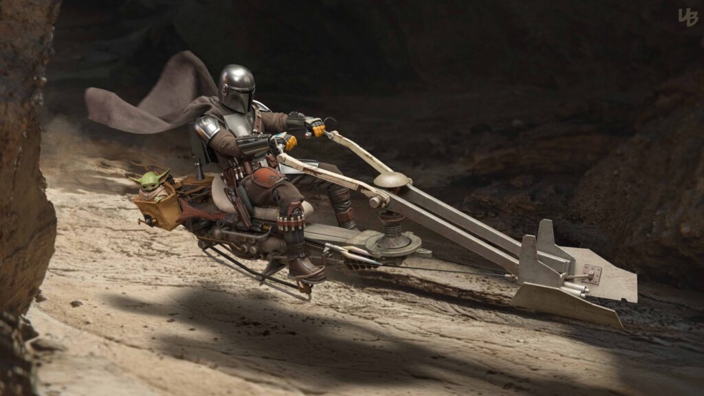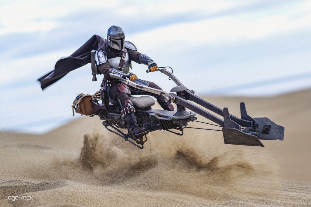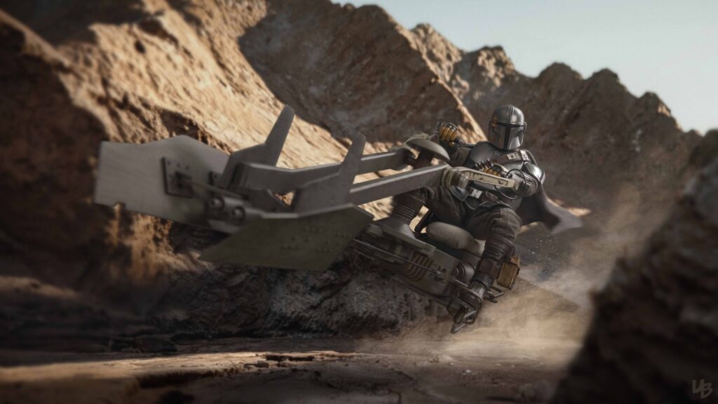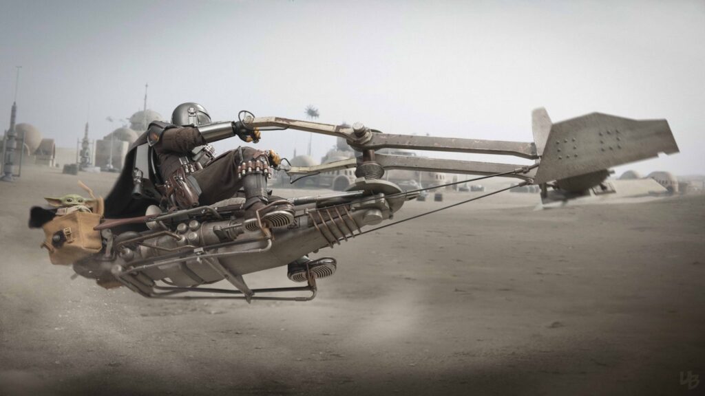 Swoops are repulsorlift vehicles that are more powerful and dangerous than speeder bikes. Swoop racing is a popular spectator sport on many planets, with fans loving the sport’s excitement as well as its outlaw image. During the Mandalorian’s journey on Tatooine, it has been a helpful transport for him to traverse the desert planet.
