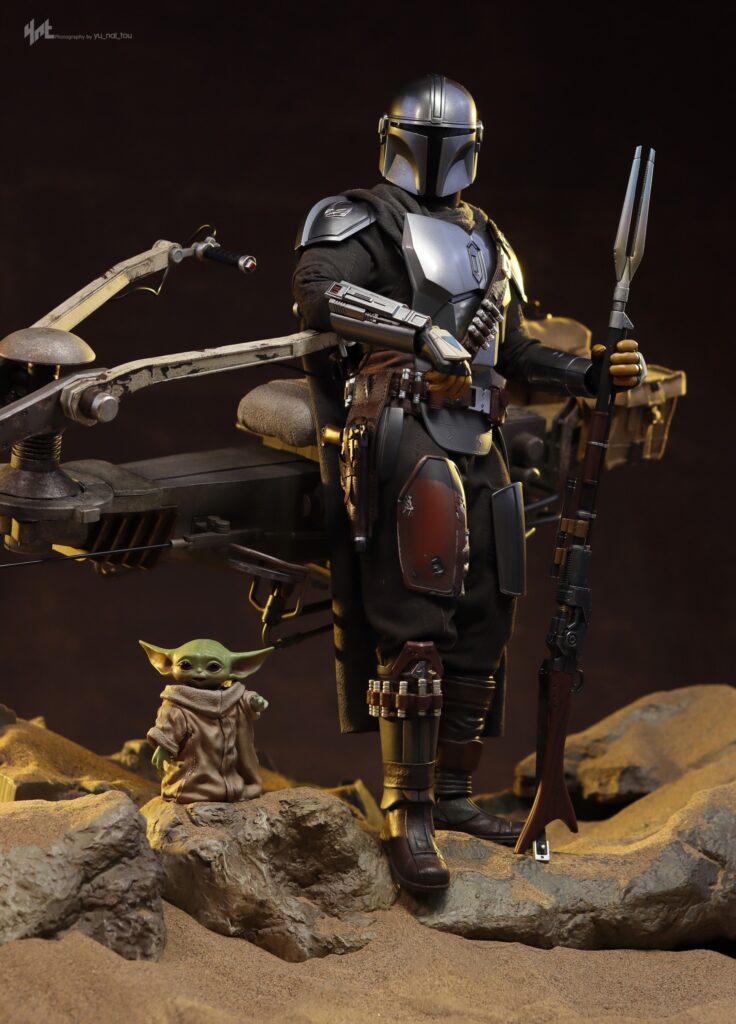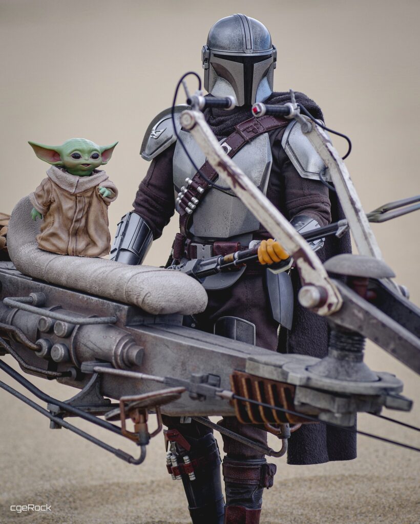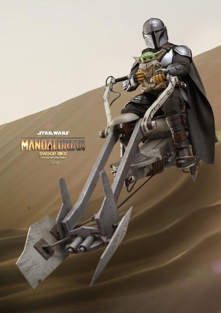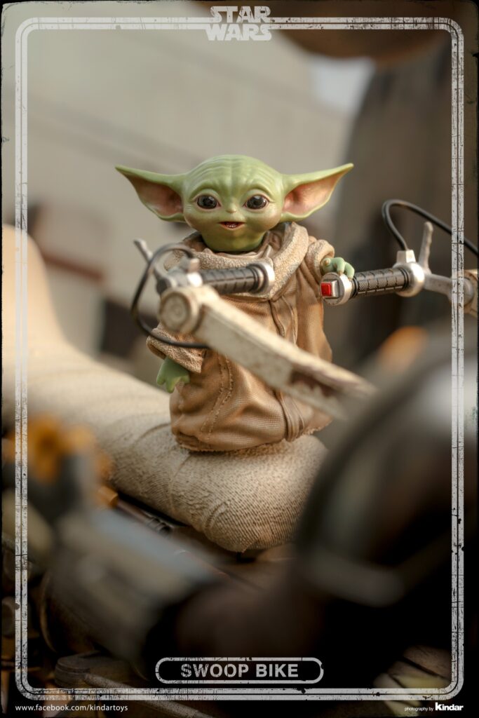 Measuring at approximately 59cm in length, the highly-accurate Swoop Bike is crafted with amazing details featuring mechanical structures with articulated parts, cargo pouches, a finely sculpted seat, and a diorama display base! Furthermore, it specially includes a 1/6th scale Grogu with his ears up recreating the memorable moment when he is riding against the wind!