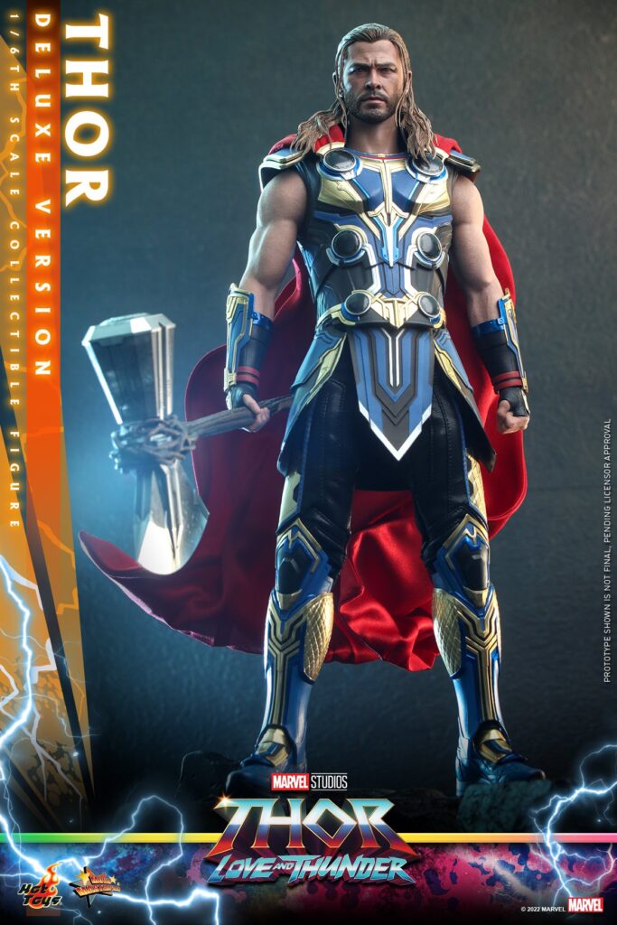 In anticipation to the release of Thor : Love and Thunder, Hot Toys is thrilled to introduce a Deluxe Version of the new 1/6th scale collectible figure of the God of Thunder – Thor with his new metallic gold and blue costume!