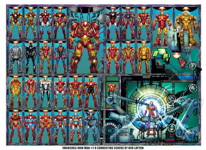 Check out the covers now, including the full Layton connecting cover that will grace the first eight issues of the series! And stay tuned later this week for the premiere of the INVINCIBLE IRON MAN trailer! For more information, visit Marvel.com.