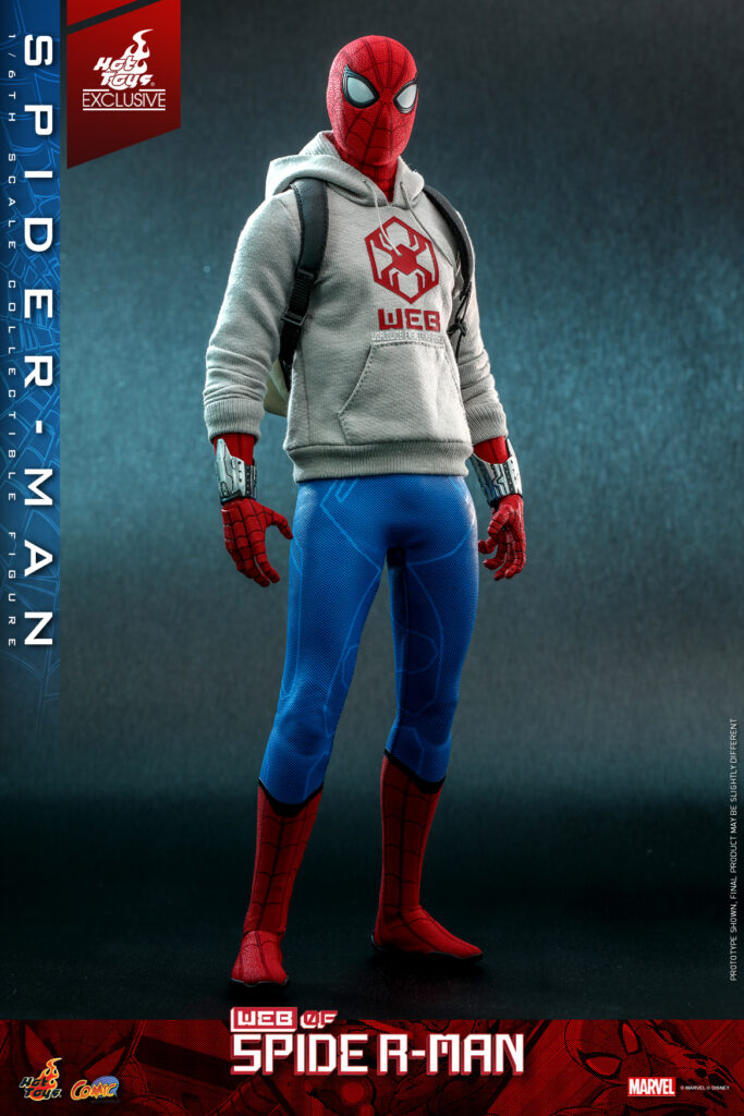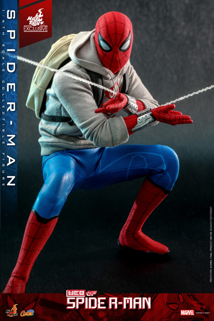 The highly-detailed Spider-Man figure features a masked head sculpt with multiple pairs of interchangeable Spider-Man eye pieces to create numerous Spider-Man’s expressions, a finely tailored red and blue suit with black web impression, a fabric hoodie, amazing accessories including a backpack, a spider bot, assorted spider-web shooting effect parts, and a dynamic figure stand.