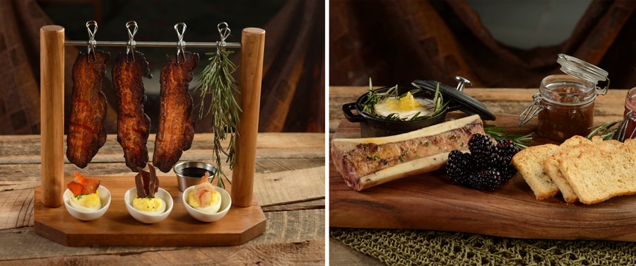 Rounding out the new menu items are the Bacon on the Wire and the Bone and Brie. The Bacon on the Wire takes a new meaning to an elevated dish with black pepper candied bacon cured in smoked paprika and bourbon, cold smoked, and roasted perfectly with a bourbon glaze. And, it doesn’t just have bacon; it features deviled eggs topped with fried shrimp, chipotle beef jerky, and salmon candy with a bourbon drizzle.